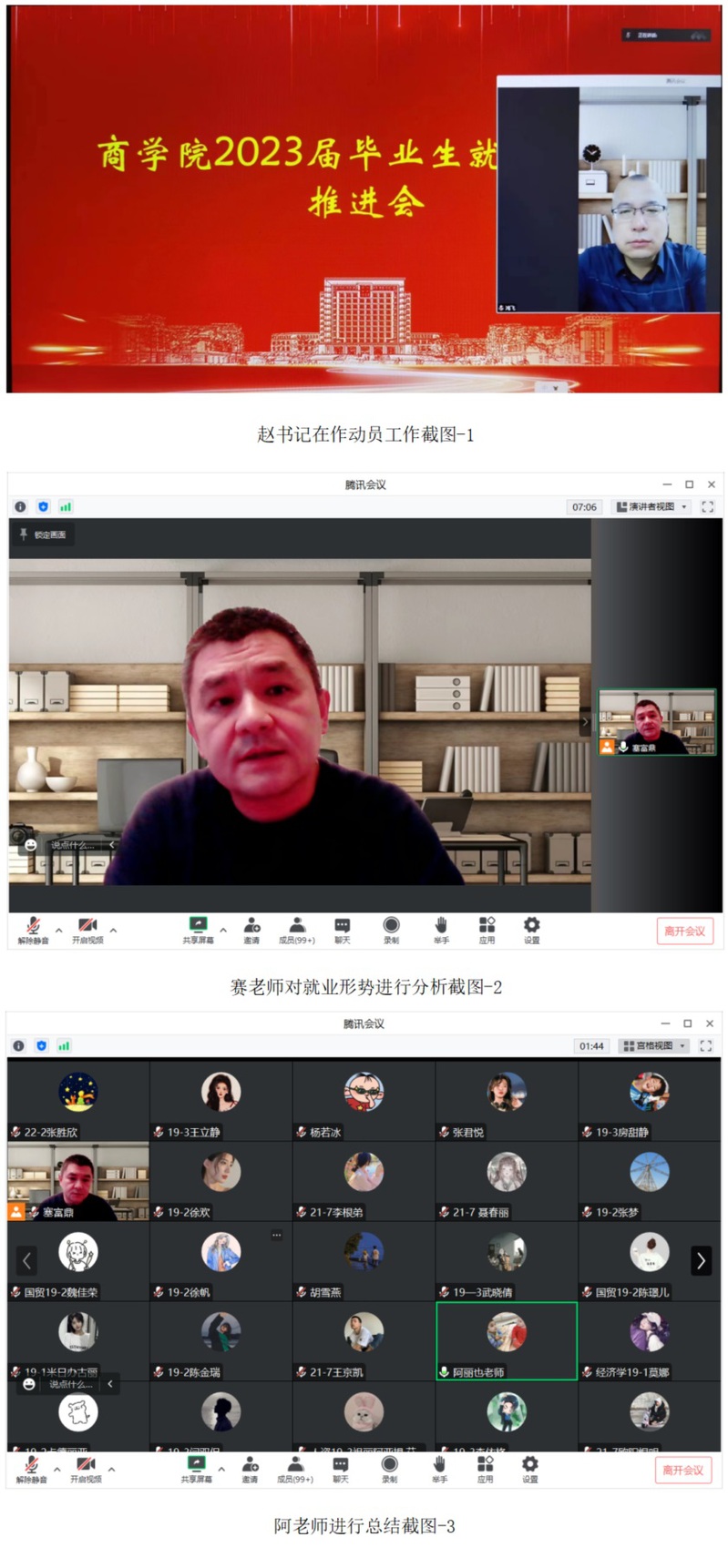 就业是民生之本,是发展之基,也是财富创造的源头活水。为积极响应党中央、国务院稳就业、保就业号召,推动永利集团3044毕业生就业工作顺利进展,提高学生的就业意识,永利集团3044于2023年2月13日以线上腾讯会议的形式开展“2023届毕业生就业推进会”。出席此次会议的有永利集团3044赵书记、阿老师和赛老师。