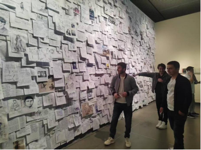 学生们在艺术家手稿墙前交流、讨论