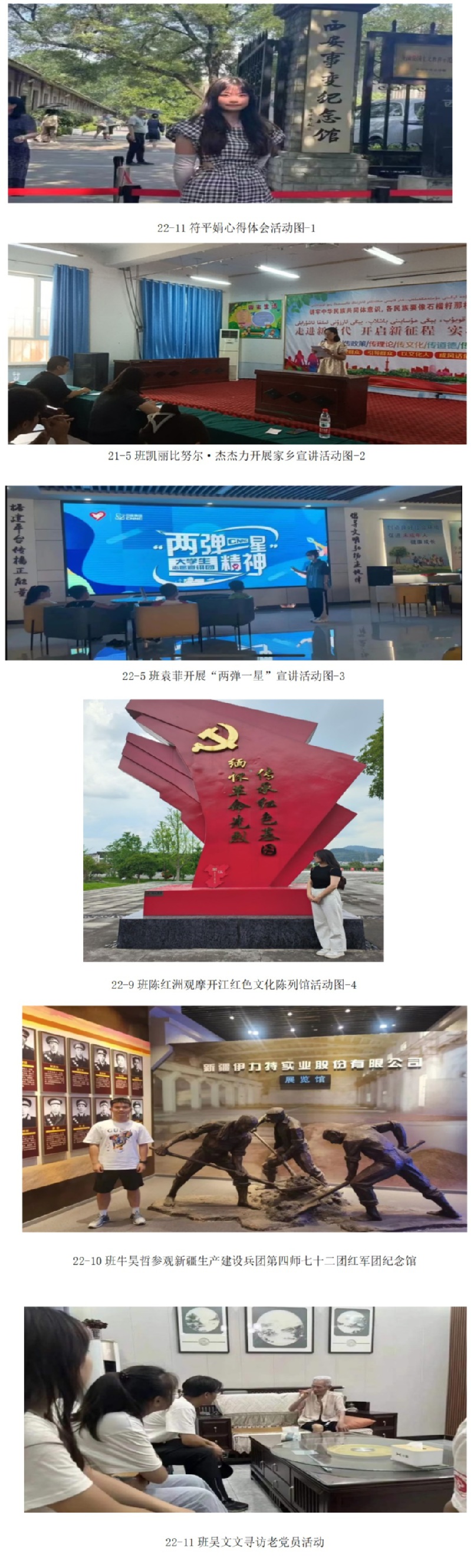 “重温党的光辉历程,行走红色教育基地。”22-9班的陈红洲克同学来到开江红色文化陈列馆进行观摩学习。开江红色文化陈列馆地处宝泉塔下,是一个典型的川东民居建筑,它用历史、地方的红色文化元素,结合现代主流表现形式,陈列展览开江县部分烈士生平事迹史料,同时利用场景、VR虚拟现实、模型、多媒体、图板等手段,生动再现开江人民对中国革命巨大贡献,全方位展示红军在开江的革命历程和丰功伟绩。此次学习陈红洲同学收获颇丰,她表示:要向开江人民学习,用上青天、揽明月的逸志,和挥斥方遒、指点江山的意气,去书写自己的青春年华。21-3班赵君杰同学参观了西安事变纪念馆,这是一座以西安事变为主题,纪念和反思现代中国历史的博物馆。西安事变是中国历史上的一次重大事件,发生在1936年12月12日,标志着抗日战争进入了一个新的阶段。纪念馆通过展览、图片、文物等多种形式,生动地再现了当时的历史背景和西安事变的经过。赵君杰同学表示,“这次参观经历使我感受到了历史的庄严和威严,更加明白了团结和抗争的重要性,同时也增强了我对国家、民族和未来的责任感。作为一位中国人,我应该时刻铭记历史,珍惜今天的和平与稳定,为实现中华民族的伟大复兴贡献自己的力量,把对革命先烈们的崇敬转化为不断前行的动力,坚定理想信念,为实现中华民族的伟大复兴贡献青春力量。” 22-10班牛昊哲同学参观了新疆生产建设兵团第四师七十二团红军团纪念馆,循着革命前辈的英雄故事,走进波澜壮阔的历史征程。走进位于团部的红军团纪念馆,首先映入眼帘的是三位红六军团主要领导人塑像,他们背后的浮雕墙依次是湘赣地区井冈山、延安宝塔山和新疆天山。馆内以丰富的历史文物、翔实的文史资料、现代化多媒体多种表现形式,全面展示了七十二团从土地革命、抗日战争、解放战争到驻守南疆三县、移防北疆伊犁、屯垦肖尔布拉克的战斗历程。同时,牛昊哲同学也感悟到:“我们要弘扬先烈的崇高精神,牢记革命传统,作为新时代青年,我们应该更好的接过老一辈军垦战士的旗帜,将它发扬光大。”